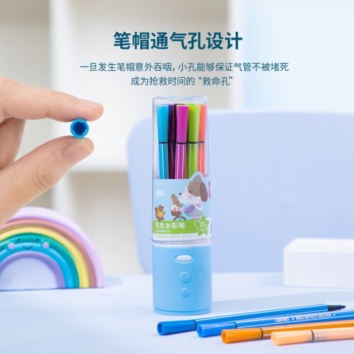 deli 得力 33985-12 儿童美术画材 可洗水彩笔 12色,水彩笔多种颜色可选,颜色鲜艳亮丽,笔触细,让你体验丝滑畅快的绘画体验。笔帽有通气孔设计,一旦发生笔帽意外吞咽,小孔能够保证气管不被堵死,成为抢救时间的“救命孔”;PP+PET包装桶,独立桶装,方便收纳,抗摔性好,用完放入书包,携带方便;拥有可水洗配方,可洗浄衣物主要可清洗棉质、涤纶、尼龙常见衣物制品,孩子玩的开心,妈妈看着放心。