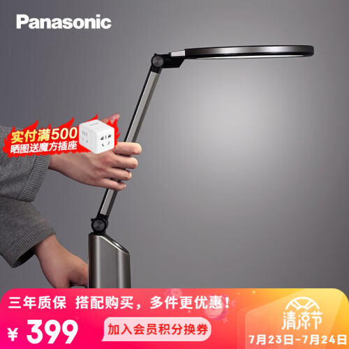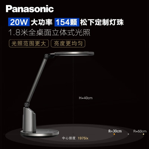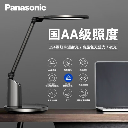 Panasonic这款致巡护眼台灯,AA级照度,舒适延缓疲劳,168颗灯珠,柔光寿命长,RG0无蓝光危害,18.5cm光源面积,舒适侧发光光源,覆盖约2米桌面,磨砂表面,RA≧95,色彩还原真实,特质钢化玻璃工艺,均匀磨砂表面,增加立体感。多功能触控与酷炫滑动,让您的指尖轻松掌控亮度。拥有工作、阅读、延时关灯、自动调光、夜灯多种功能模式,环境亮度感应装置使注意力不再被动分散。恒流模拟调光技术,通过保证电流的稳定性让台灯在高亮度或低亮度时都能杜绝闪频。功率:20W,光通量:700LM。