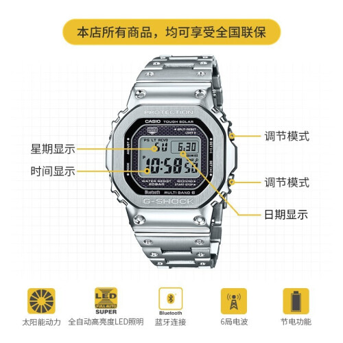 GMW-B5000全新型号在G-SHOCK金属方形表款基础色.上加入创新功能,表壳、表圈及内部的结构皆由不锈钢制成,并采用全新耐冲击结构,表带使用轻巧耐用的树脂,提升佩戴舒适性且减轻手表重量。GMW-B5000GD系列搭载智能蓝牙,连接功能,通过连接专属软件,“SHOCKConnected" ,实现时间的智能记录及管理功能。以高度感电波信亏按收,进时间校正,电波接收涵盖全球共六座标准时间发射塔。接收来自日本2局福岛、九州、中国、北美、英国、德国的讯号,自动进行时间校正。