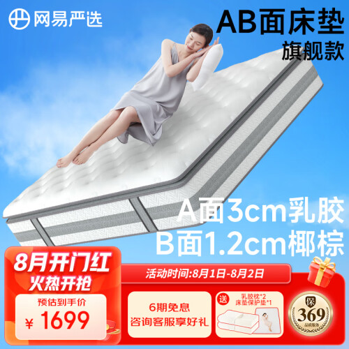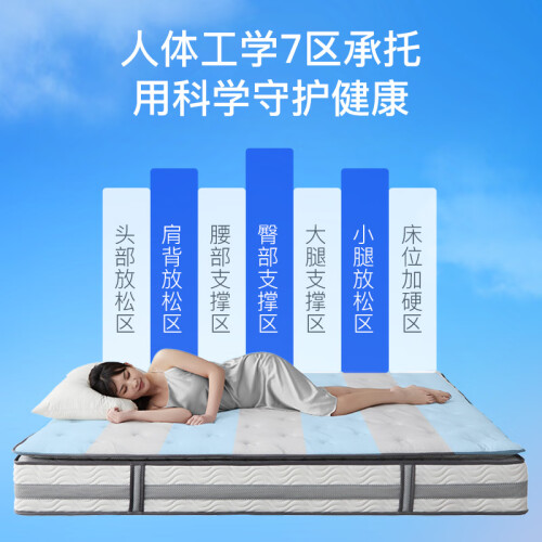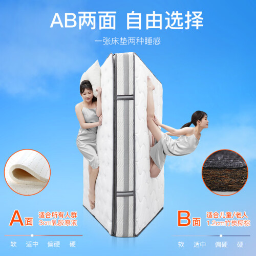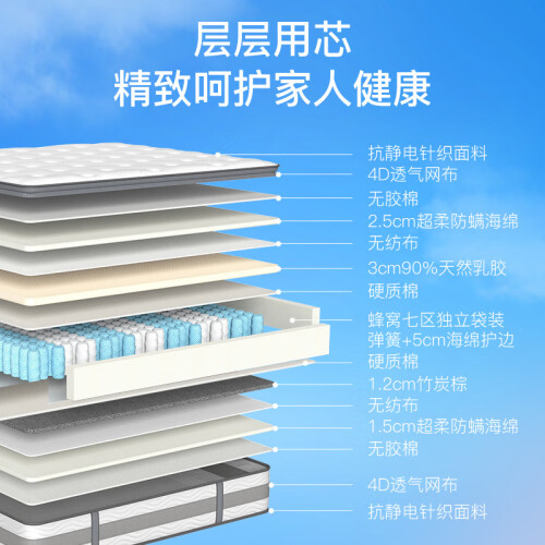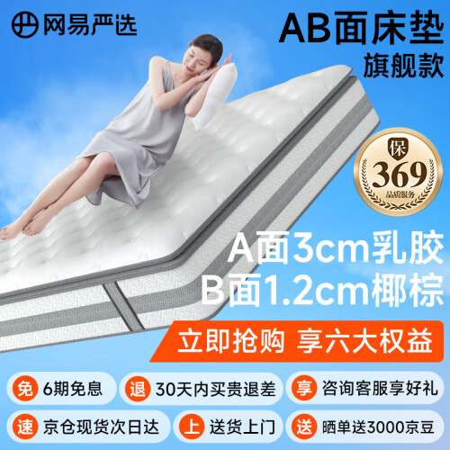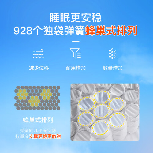 YANXUAN 网易严选3999368床垫采用两面设计,冬夏两面可用。A面3cm乳胶托扶,远赴马来西亚橡胶树林采集乳胶原液,90%高浓度,经打孔发泡工艺保证更好的透气回弹性,如肌肤般的软糯回弹,给予身体更贴合的舒适。B面采用1.2cm环保竹炭椰棕,天然椰丝热压成型,立体弹性结构犹如植物小弹簧,添加竹炭微粒,具有吸湿除味性能,犹如睡进护养生舱,带来整晩清爽好眠。已知弹簧数量越多,支撑点越多,承托力更强。这款床垫采用928个独袋弹簧蜂巢式排列,通过改变弹簧排列方式,打造承托更精准的弹簧矩阵,提升舒适性,同时稳定床网增强使用寿命。天然乳胶、七区弹簧、竹炭椰棕三重材质层层精选黄金配比,舒软而不塌,硬挺而不僵。床垫表面4D面料包裹,4D面料呈蜂窝状结构分布,气孔更大,透气更好加快人体在睡眠中释放的汗液和湿气排出, 保持床垫干爽透气。