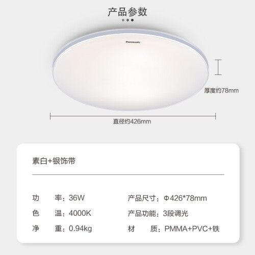 均匀的光线,为您提供舒适照明环境,高透光PMMA材质灯罩,厚度均匀出光柔和;无蓝光危险,光线更舒适;松下定制LED芯片,更严苛的松下检测实验,基础材料采用更好的物料,线材采用高金线,绝缘胶及荧光粉采用国际品牌的部品;4000K接近自然光,显色指数Ra>80,自然光线,真实还原物品色彩。