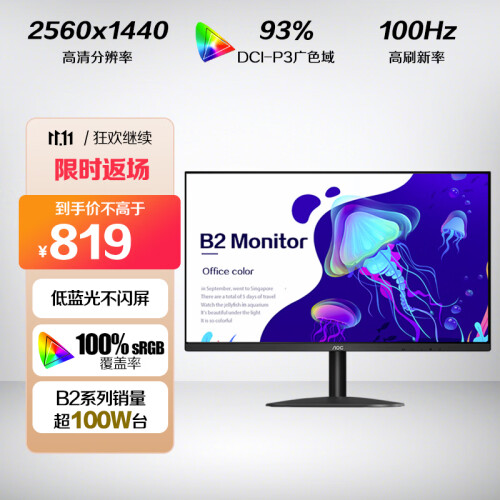 当前的位置: 首页 > 今日值得买 > AOC 27英寸 2K高清 100Hz IPS广色域 低蓝光不闪 三边微边 超薄机身 节能办公电脑显示器 Q27B2S2