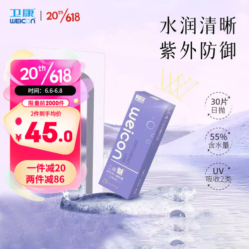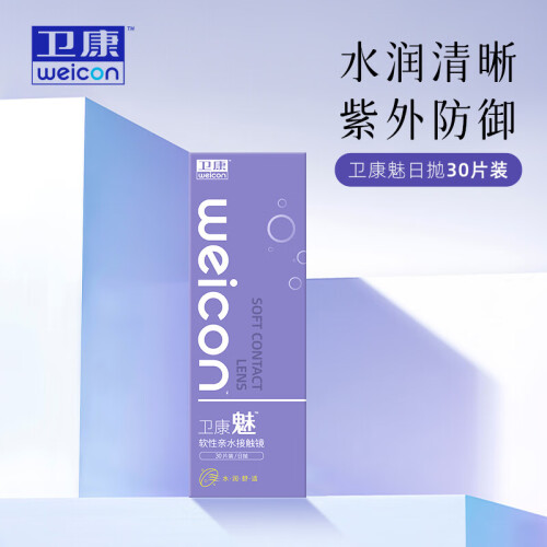 Weicon(卫康)隶属于上海卫康光学眼镜有限公司旗下,是国内眼镜品牌,目前在国内口碑不错,深受佩戴隐形眼镜同学的欢迎。水润清晰,紫外防御,日抛,UV吸收2类,12h长时佩戴,水润舒适配戴体验,可以吸收紫外线的软性亲水接触镜。无需护理,用完即抛,免去繁琐镜片护理