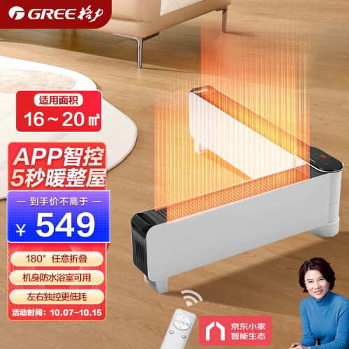 GREE 格力 NDJD-J6021B 踢脚线取暖器,可灵活折叠,多角度摆放,左右独立控制,热能空气墙,5S速热,IPX4级防水,WiFi智能操控,24H定时预约,三重防护,过热保护、倾倒断电、安全童锁。