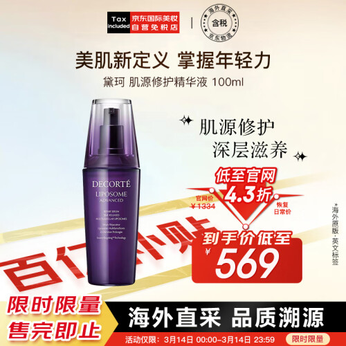 当前的位置: 首页 > 今日值得买 > 黛珂(DECORTE)肌源修护精华液100ml 第二代小紫瓶肌底液 滋润 护肤礼物