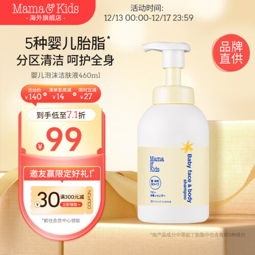 当前的位置: 首页 > 今日值得买 > Mama&Kids婴儿泡沫洁肤液氨基酸沐浴露洗面奶二合一0-3岁婴儿男女全身通用 正装460ml