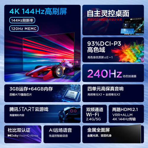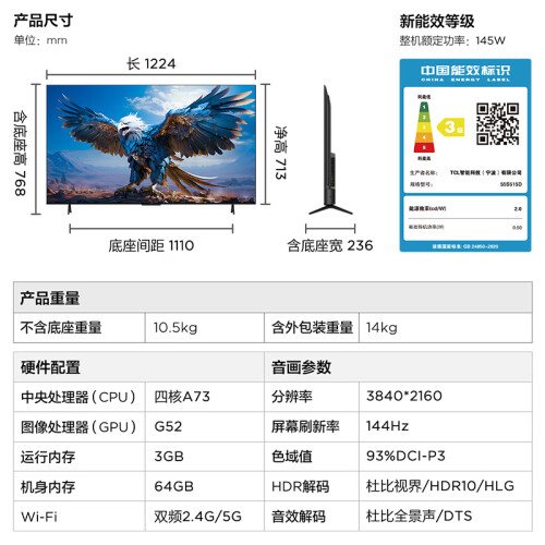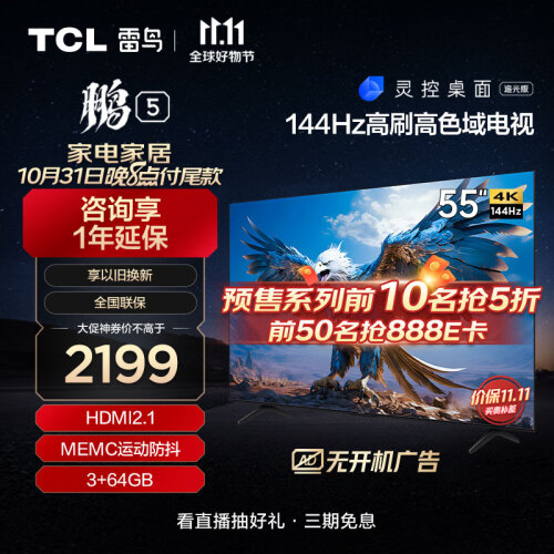 当前的位置: 首页 > 今日值得买 > TCL雷鸟 鹏5系 55英寸游戏电视 144Hz高刷 全面屏 HDMI2.1 3+64G 智能液晶平板电视机新55S515D