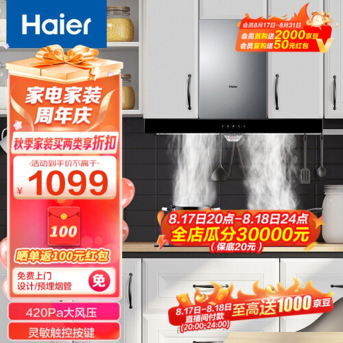 当前的位置: 首页 > 今日值得买 > 海尔抽油烟机 顶吸欧式吸油烟机 19立方大吸力 420pa大风压 大吸力 自动清洗 厨房家用排烟机 【单烟机3S】高频自清洗+触控面板+低噪烹饪
