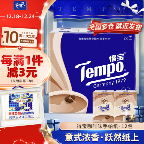 当前的位置: 首页 > 今日值得买 > 得宝(TEMPO)手帕纸 咖啡味4层*7张*12包迷你纸巾小包 印花面巾纸 卫生纸