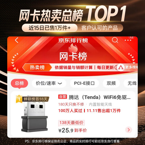 当前的位置: 首页 > 今日值得买 > 腾达(Tenda)WiFi6免驱动 usb无线网卡 内置智能天线 台式机笔记本电脑无线wifi接收器 随身wifi发射器