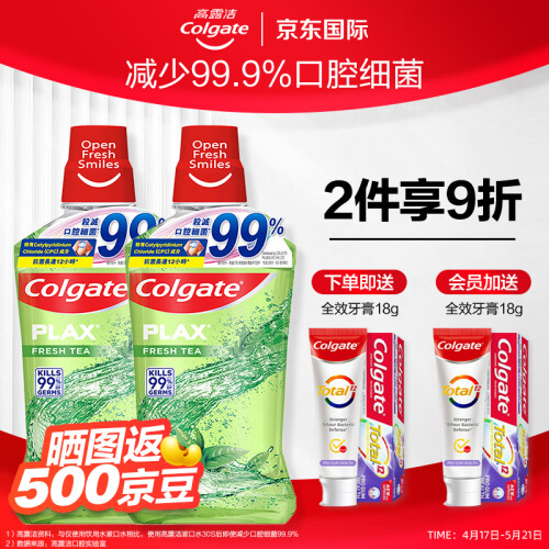 当前的位置: 首页 > 今日值得买 > 高露洁(Colgate)茶健漱口水500ml*2防蛀牙99%杀菌清新口气牙结石口臭去黄
