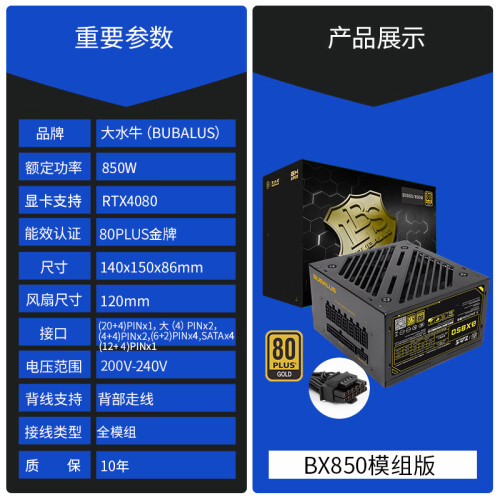 当前的位置: 首页 > 今日值得买 > 大水牛(BUBALUS)额定850W BX850金牌全模电脑电源(原生PCIe5.0/易插智能模组/双CPU+4显卡接口/单路12V/长扁线)