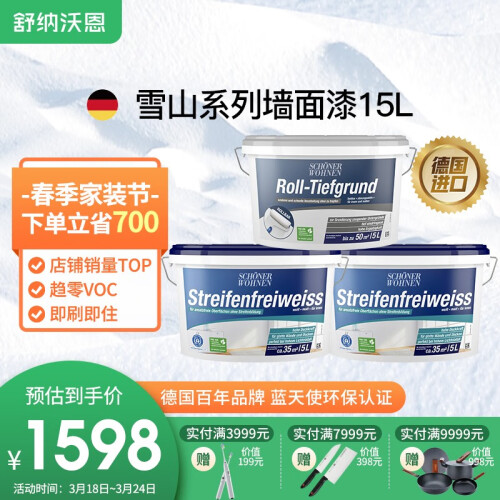 当前的位置: 首页 > 今日值得买 > 舒纳沃恩乳胶漆雪山白 德国原装进口 净味环保内墙漆水性油漆涂料墙面漆 白色(两面一底)15L