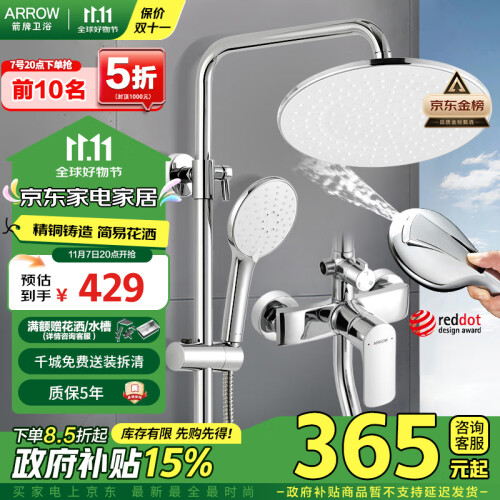 当前的位置: 首页 > 今日值得买 > 箭牌(ARROW)浴室淋浴花洒套装 红点奖增压淋浴喷头 沐浴淋雨淋浴器AE3354MS-P