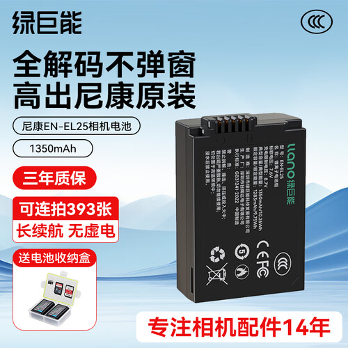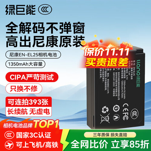 当前的位置: 首页 > 今日值得买 > 绿巨能(llano)尼康电池z30相机电池z50二代 z50ii z50II z502 z50 zfc en-el25相机备用大容量电池充电器充电仓 【3C认证】1350mAh单电池