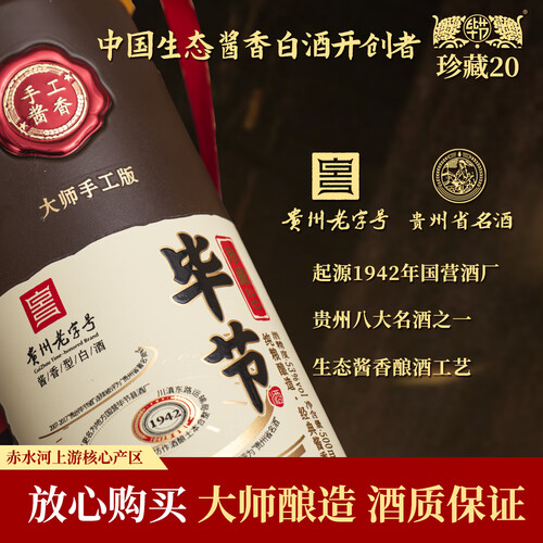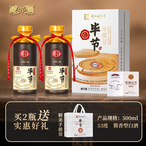 当前的位置: 首页 > 今日值得买 > 毕节珍藏20 贵州老字号 纯粮酱香型白酒 起源1942年国营酒厂 53%vol 500mL 1瓶 满两件赠礼袋