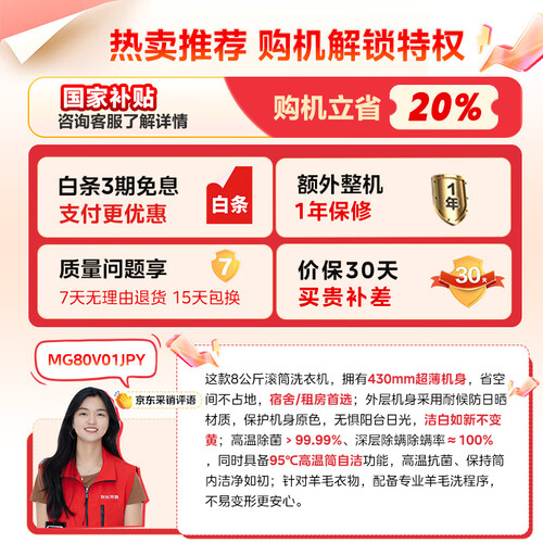 当前的位置: 首页 > 今日值得买 > 美的(Midea)滚筒洗衣机全自动家用 MG80V01JPY 8公斤超薄 巴氏除菌 三重洗涤守护 以旧换新 家电国家补贴20%