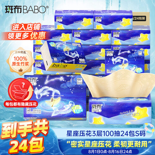 当前的位置: 首页 > 今日值得买 > 斑布抽纸3层100抽*24包S码 竹韧星座系列 原生竹浆纸巾 本色纸 整箱