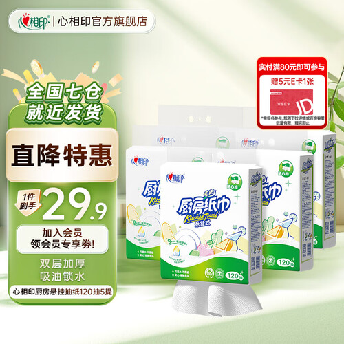 当前的位置: 首页 > 今日值得买 > 心相印厨房纸巾悬挂式抽纸提装擦手一次性方便吸油吸水去油污 【9倍吸油锁水】 2层 120抽*5提