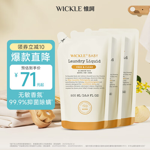 当前的位置: 首页 > 今日值得买 > WICKLE婴儿洗衣液新生婴儿宝宝专用酵素抑菌洗衣液补充装 【新品】悠悠桂花香500ml*3