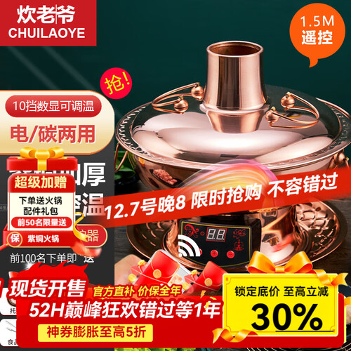 当前的位置: 首页 > 今日值得买 > 炊老爷 铜火锅碳电两用纯紫铜老式插电木炭铜锅火锅鸳鸯铜锅具涮肉暖锅 30CM遥控单味锅【2-4人】