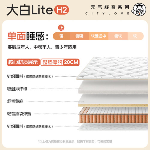 当前的位置: 首页 > 今日值得买 > 城市爱情喜临门床垫 偏硬黄麻床垫独立弹簧双人硬床垫子席梦思大白Lite H2 大白H2(偏硬款 黄麻舒脊) 1.5*2.0米