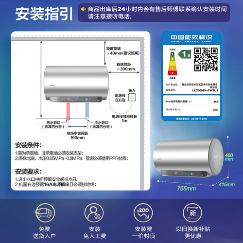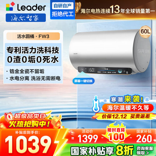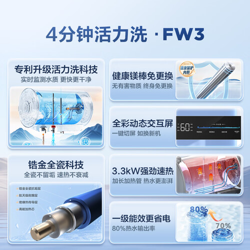 当前的位置: 首页 > 今日值得买 > 海尔(Haier)智家出品Leader统帅系列活力洗电热水器60L健康镁棒免更换3300W速热一级能效省电 【下市特价FW3】 60L 3300W 4分钟水质焕新