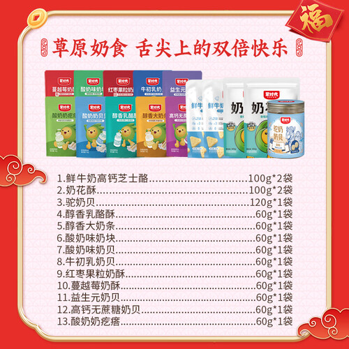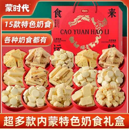 当前的位置: 首页 > 今日值得买 > 蒙时代圣诞礼物内蒙古特产奶食大礼包驼奶贝奶泡泡奶酪棒15款年货送礼 1120g1盒【超值大礼包】