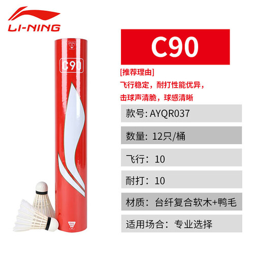 当前的位置: 首页 > 今日值得买 > 李宁(LI-NING)耐打飞行稳定专业比赛训练用球鹚豚鸭C系列鸭毛羽毛球C10 C80 C90 12只装 1筒 C90精品鸭毛-77速