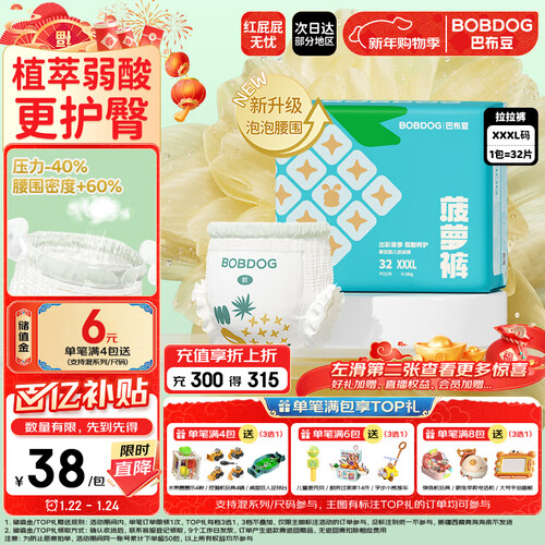 当前的位置: 首页 > 今日值得买 > 巴布豆(BOBDOG)新菠萝拉拉裤XXXL32片(17kg以上)婴儿尿不湿 超薄