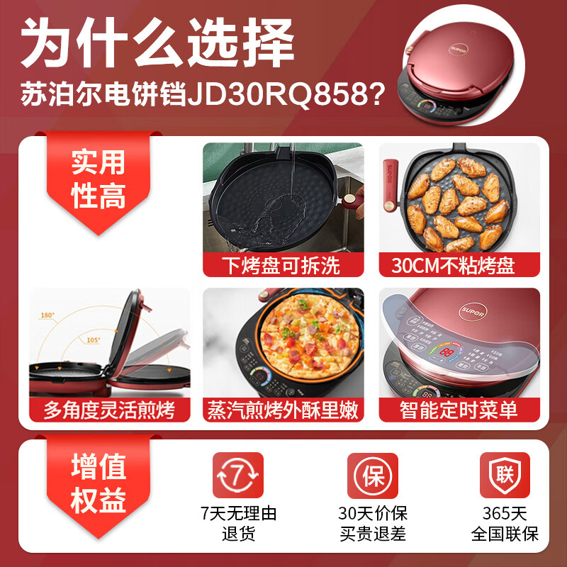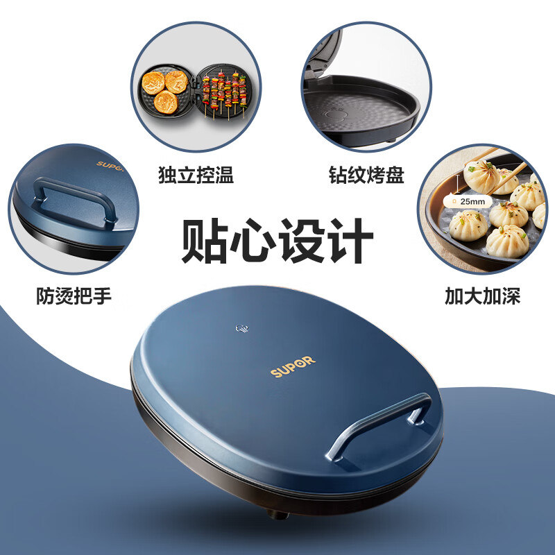 自动断电,加深加大, 独立烤盘,4档火力调节,前置开关防烫,上下烤盘独立加热,菱心砖石烤盘,加厚接口持久耐用,小巧易收纳,速脆技术,饼类,煎烤类,特色类,一机多能。