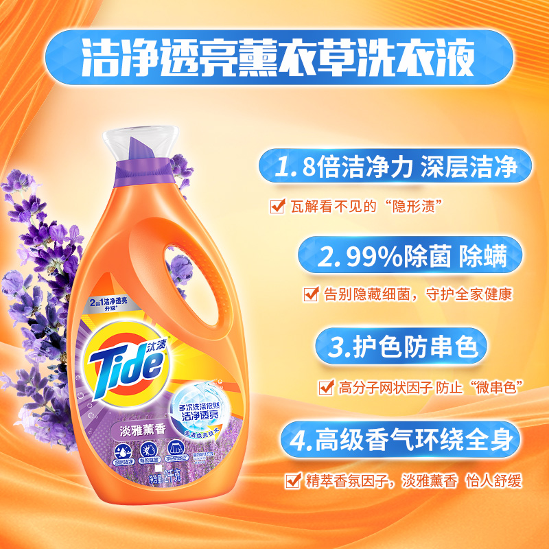 汰渍洁净透亮除菌除螨持久留香薰衣草香洗衣液4斤