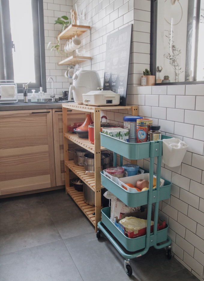 厨房橱柜空间不够,需要入手收纳架做补充,千万不要用不好挪动的收纳架,地面会形成卫生死角。