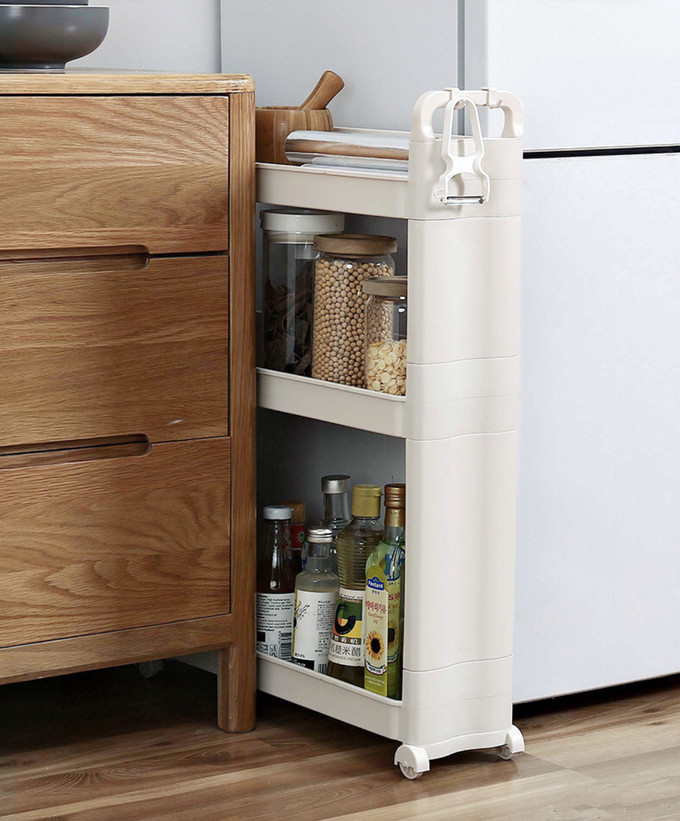 厨房的夹缝空间,一样要用带轮子的,这样收纳杂物、饮料零食的时候,抽出来就能拿到。
