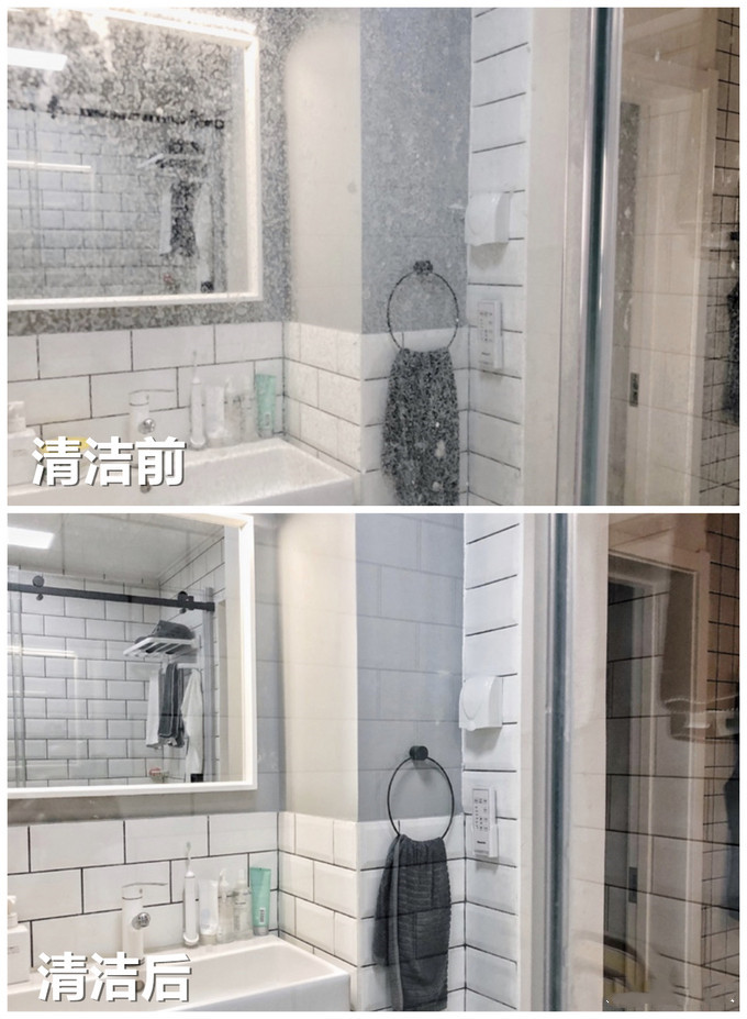 镜面上的水垢也是一样的清洁方式,如果是比较严重的水垢,建议加大喷洒量。