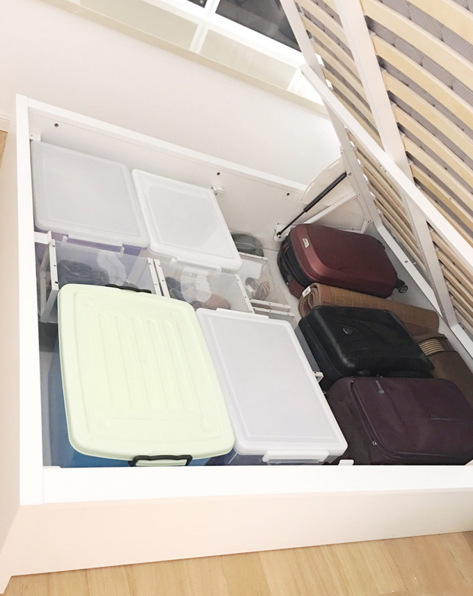在收纳方面,普通的落地床,是掀开床板在里面收纳的,一旦收进去,就有很大的遗忘概率,也会懒得再拿出来。
