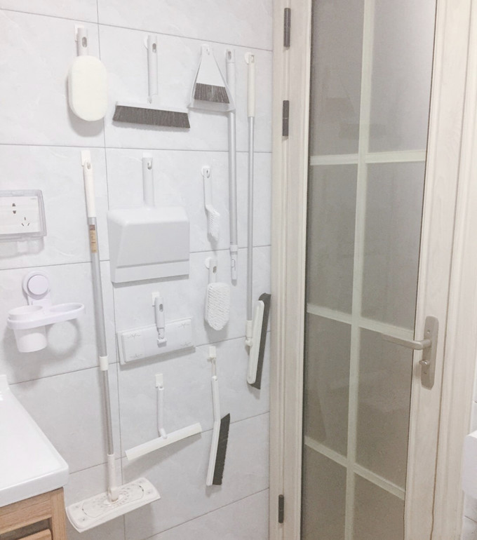 清洁工具,如果直接随便堆放,也是比较乱的,把卫生间门后空间利用起来,壁挂在墙面上,就能瞬间整洁起来。