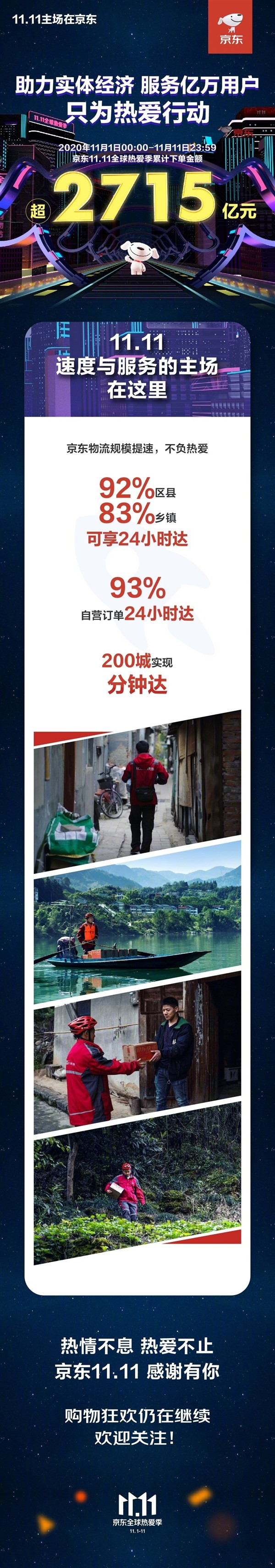 来自京东官方的数据显示,今年的“11.11京东全球好物节”累计下单金额超过2715亿元,确切地说是271538423910元,比去年的2044亿元增长了32.8%,略高于天猫去年的2684亿元。