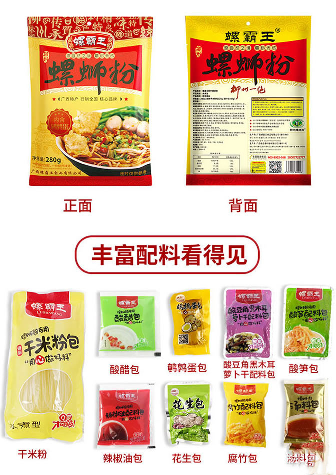 螺霸王隶属于广西螺霸王食品有限公司,企业成立于2015年,是集研发、生产及销售于一体的全面型食品公司。螺霸王螺蛳粉传承柳州内味,古法熬制的汤底鲜香浓郁,搭配嫩滑劲道的粉以及老坛发酵酸爽脆嫩的笋,让人欲罢不能!此外,螺霸王在包装上面狠下功夫,就连配料中也比一般螺蛳粉多了两个鹌鹑蛋,堪称画龙点睛。