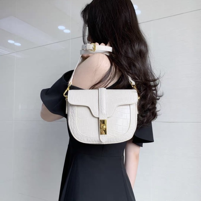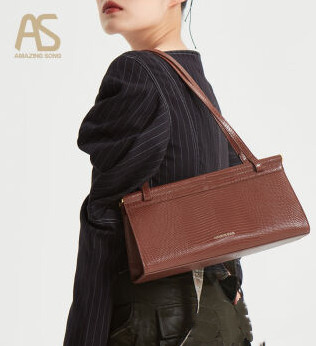 这一款是乘风破浪的姐姐里李斯丹妮背的同款,看到照片的第一眼觉得非常的复古时髦。整体的包型是很简约经典的法棍腋下包的包型。侧面是小三角型的形状,所以整体的容量也是还蛮大的。它的颜色是很适合现在这个季节的深酒红色,稍稍偏红棕色系一点,然后它的材质是牛皮的材质,上面有仿蜥蜴纹的印压花纹,超级精致的。对有纹路的包包简直毫无抵抗力!包包开合的地方做了一个金属扣的设计,拿东西也会非常的方便,里面也是皮的材质哦。这款包随便搭配一件毛衣单肩背在腋下都会非常的好看哦,或者搭配一件秋冬的大衣、格纹西装外套都会很复古时髦。