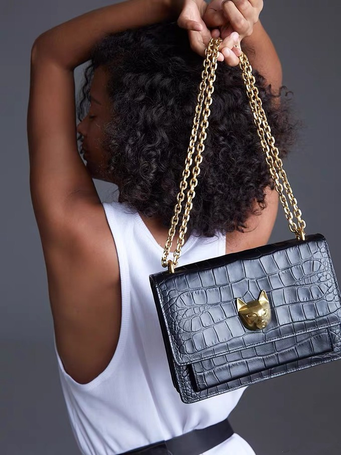 推荐这款经典的黑色猫神包,这款包就偏贵许多,2799软妹币。它就是一个非常哑光雾面的一个鳄鱼皮压纹的一只牛皮包包。那这只包整个是比较硬一点点的这种材质。这里着重想要介绍它的五金,它的五金是黄铜镀金,所以呢非常的有分量感,一摸上手你也会觉得特别有质感,相较来说就是可能会有一点点分量,但绝对是在女生可以承受的范围内,不会说背一天会觉得很有负担感。这个包里面的皮质相对来说会比外面的更加的柔软一点。这个包包可以搭配一些比较个性的衣服或是比较法式风格的服装,搭配起来都会很有时髦感和复古感。大小正正好合适,属于春夏秋冬都可以背的一个包型。如果有预算的话,非常推荐购入一只。