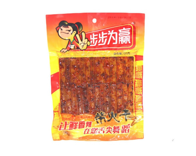 步步为赢的包装算得上是辣条里的中产阶级了,看起来比一般的辣条显得干净整洁,辣条本身长相虽然平平无奇,但是不同的是打开来会有一股清新的豆奶味道,吃到嘴里有嚼牛筋的错觉,不太能吃辣的朋友可以试试这个牌子,微辣,油也比较少,吃太多也没有腻味的感觉。