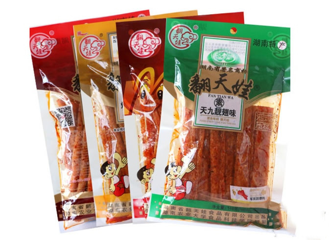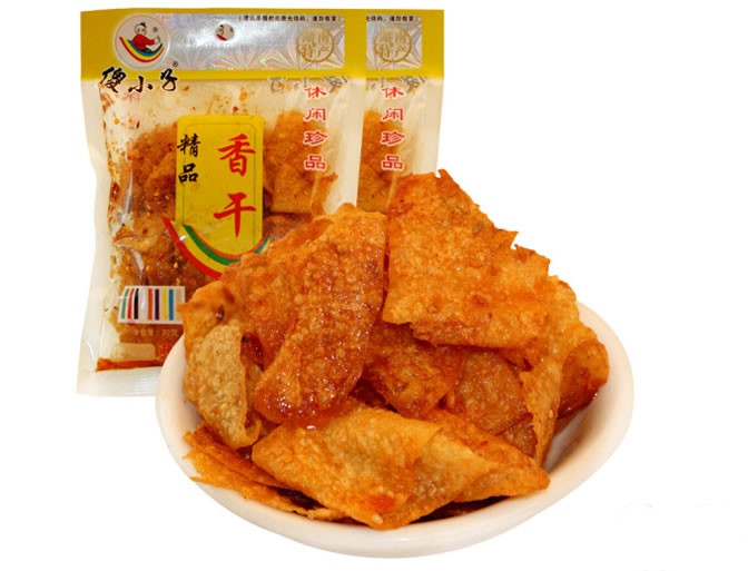 傻小子算不上严格意义上的辣条,他家卖得最好的是干豆腐皮,打开闻味,是类似于臭豆腐的味道,搭配洒在上面的芝麻粒,第一口是甜与鲜,第二口开始辣味蔓延到舌尖,第三口就是孜然粉的香味满满地溢出唇齿间,又脆又香,是看剧时的绝佳搭配。