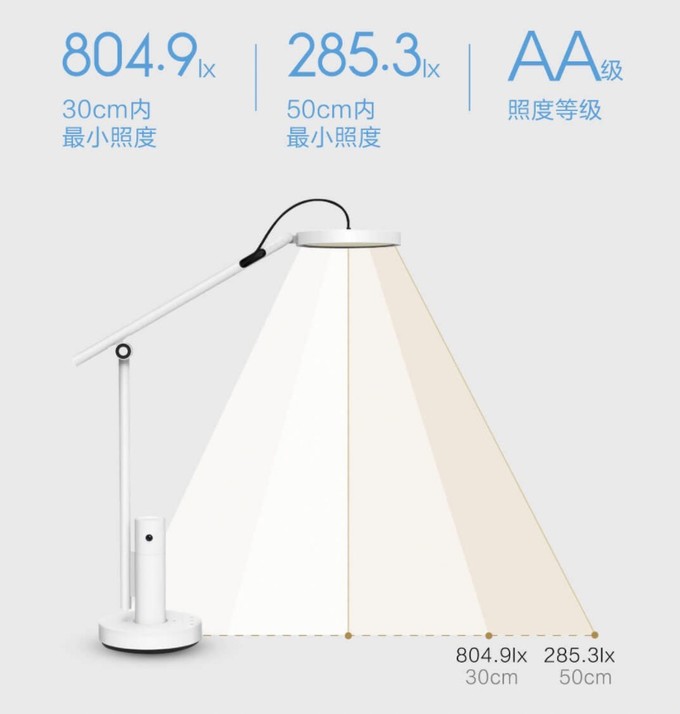 小白智能看护灯超过国家AA级照明标准,光照均匀,照明范围最高可达1.6㎡。并且无有害蓝光,无频闪。台灯支持按键5挡调光,APP无极调光,台灯的LED光源显色指数高达Ra95,对于孩子的视力给予全面防护。