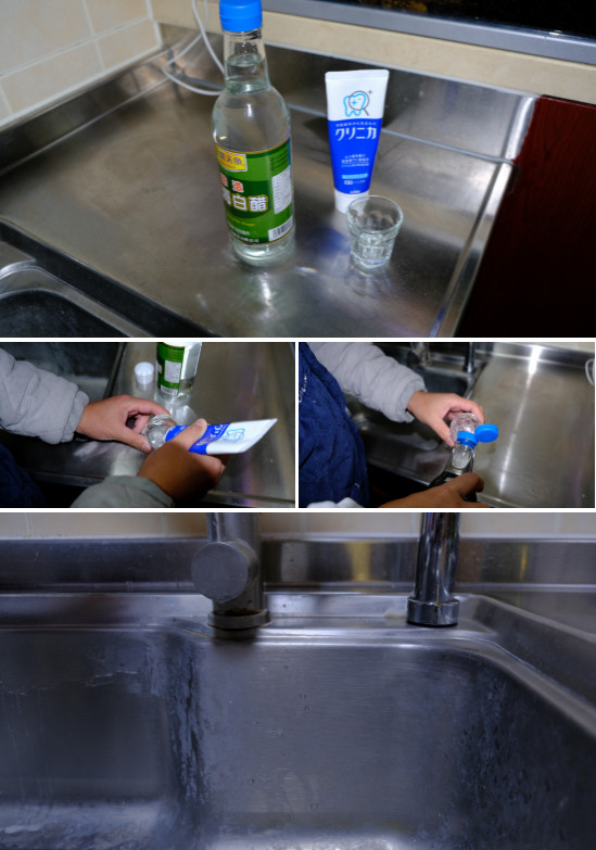 这两种溶液加在一起可以去油去污,对着马桶水箱或者下水道喷洒都有一定除味的作用,同时用来擦洗水池也有很好的增光作用!