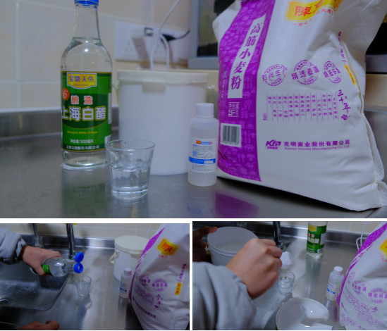 比例是:半杯水,肥皂粉1:白醋2:酒精3:面粉0.5