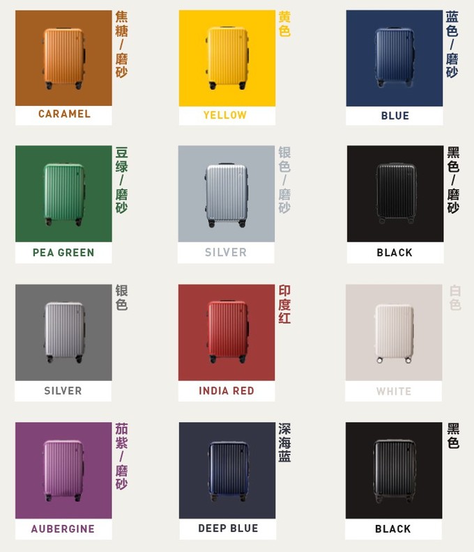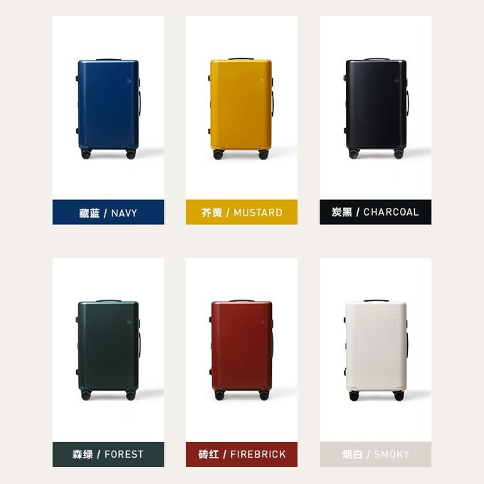 GINKGO 系列有砖红、森绿、芥黄、藏青、赤铜、炭黑六种摩登色彩可供选择,满足不同的个性需求。外壳有镜面、条纹2种设计,配有20寸、24寸、28寸,三种大小箱形。