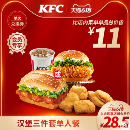 【618会员专享】电子券码 肯德基 汉堡三件套单人餐兑换券