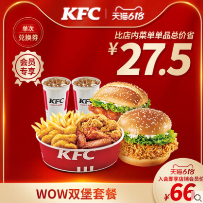 【618会员专享】电子券码 肯德基 Y78 WOW双堡套餐兑换券
