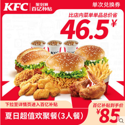 【百亿补贴】电子券码肯德基 Y54 夏日超值欢聚餐(3人)兑换券
